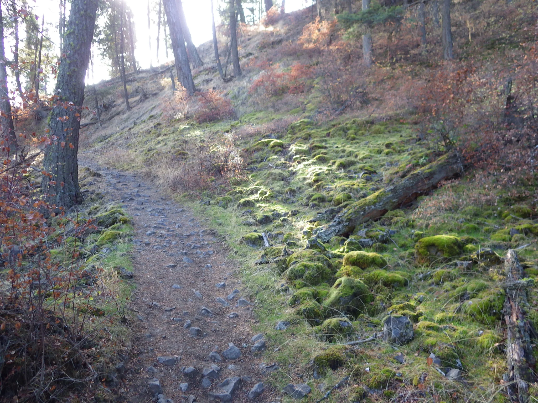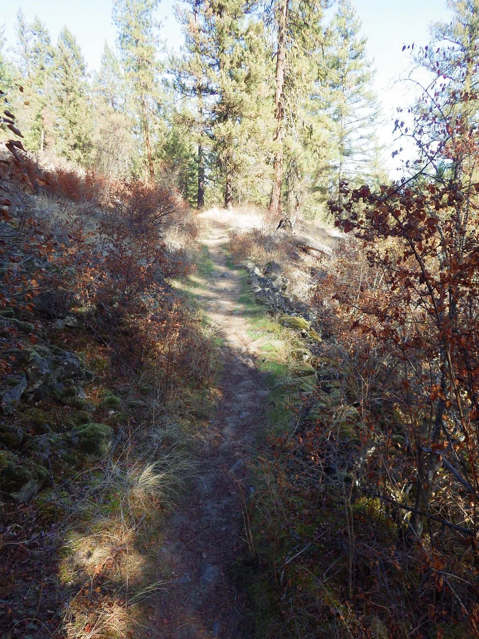 I had a choice of dropping down and running by the Spokane River or hill-running. Being a glutton for work, I ground my way up. There's a whole network of trails, mostly well marked. All the ones I hit had good footing though a couple of stretches had enough rock that I paid attention, lest I land in the emergency room. The pictures are from today's run.